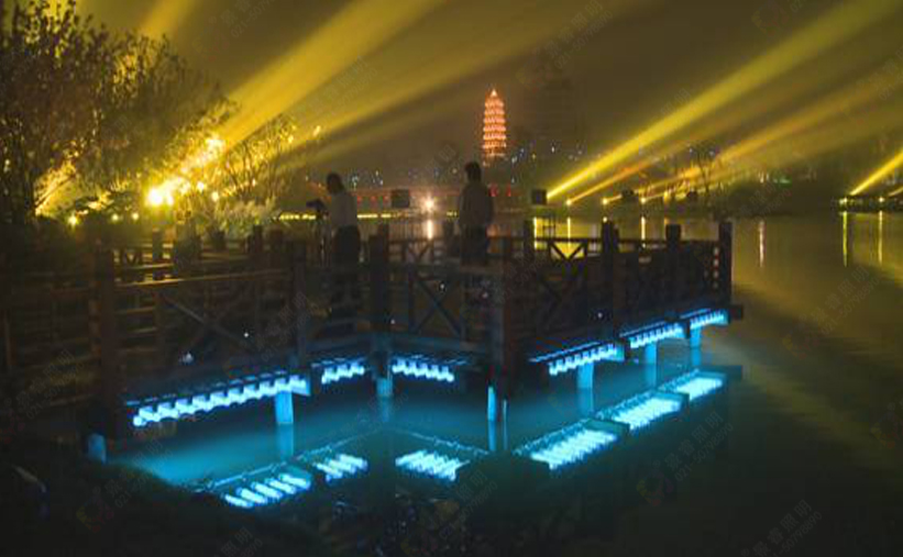 景睿照明在做灯光设计之初,确定扬州万花园二期景观照明项目侧重点——水域周围的水中长廊、亭台、木栈道、树林等。