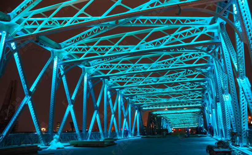 2009年2月25日,经过近一年修整的上海外白渡桥又回到了他曾矗立了102年之久的苏州河口。这次修整不仅对桥梁钢结构重新加固,整座桥梁的景观照明也做了跨时代的变更。原有的小功率高压钠灯泛光照明灯具全部拆除,取而代之的是体积更小、更加节能、白天隐蔽性更好,而且可以变换色彩的LED照明灯具。为了达到照明设计师的要求,专门设计、制作了两款线性洗墙灯,在达到灯光效果的同时,尽可能缩小灯具的外观尺寸,减小灯具白天对桥梁的景观影响,在有限的灯具内部空间里,须配置小巧的防眩光格栅结构。
